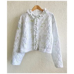 ペールトーンのボタニカル柄がかわいいリメイクキルティングジャケットに、
