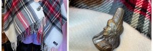 マフラーはド定番柄、赤白タータンはワイド幅なのでケープにぴったり◎