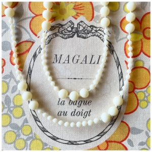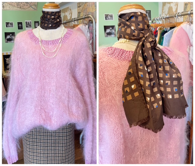 スカーフの下は柔らかモヘアと相性の良いクリーミ―カラーなロングネックレスの2連使い、