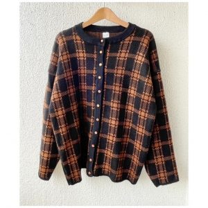 オレンジブラウン×ブラックのレトロシックなチェック柄ニットカーディガンに