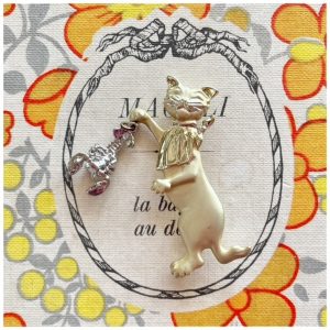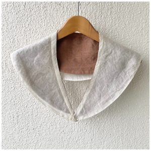 シアー素材のダブル付け襟の先端にはネコちゃんブローチを、