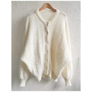 肩にかけたのはふんわりエアリーなオフホワイトニットカーディガン。