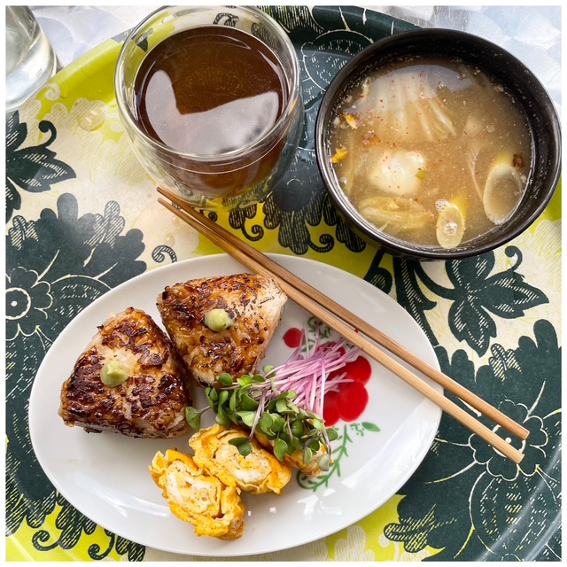 焼きおにぎりでも堪能した松本米。お米に、卵焼きに、お味噌汁。
