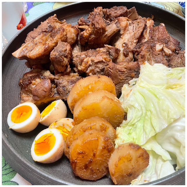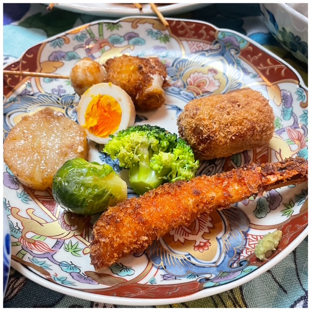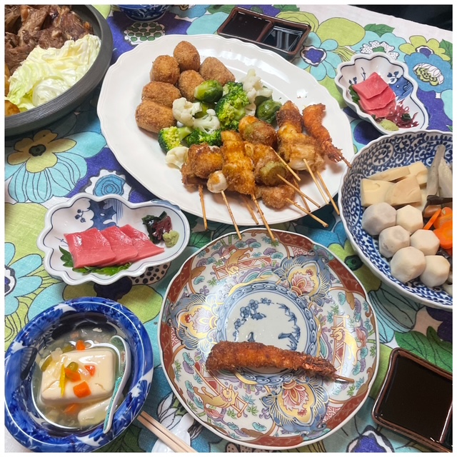 今回は、角煮に串揚げをメインに、コロッケ、エビフライ、刺身、煮物と