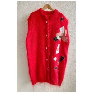 鮮やかレッドのモヘアニットベストと透かし編みホワイトニットの